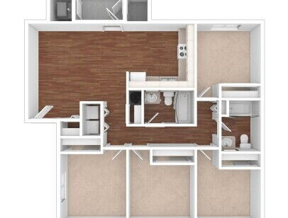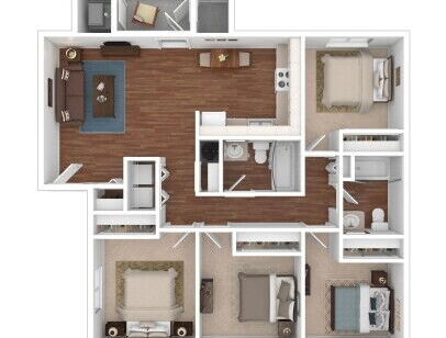 Our four-bedroom Bluebell floor plan features two full bathrooms, a fully-quipped kitchen, and a private patio or balcony.